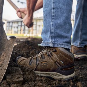 Tags: 1025613, activity:Trail, activity:Trail>Day Hike, activity:Work, activity:Work>Warehouse & Transportation, EH-Rated, Environmentally Preferred Leather, filtercolor:brown, gender:Men's, KEEN.DRY, KEEN.ReGEN, model_number:m-flint-ii-mid-wp-soft-toe-14025, Oil- And Slip-Resistant, Reflective, shoetype:Boot, size_guide:mens, Soft Toe, toetype:Soft Toe, Work, YCRF_Footwear, YGroup_m-flint-ii-mid-wp-soft-toe